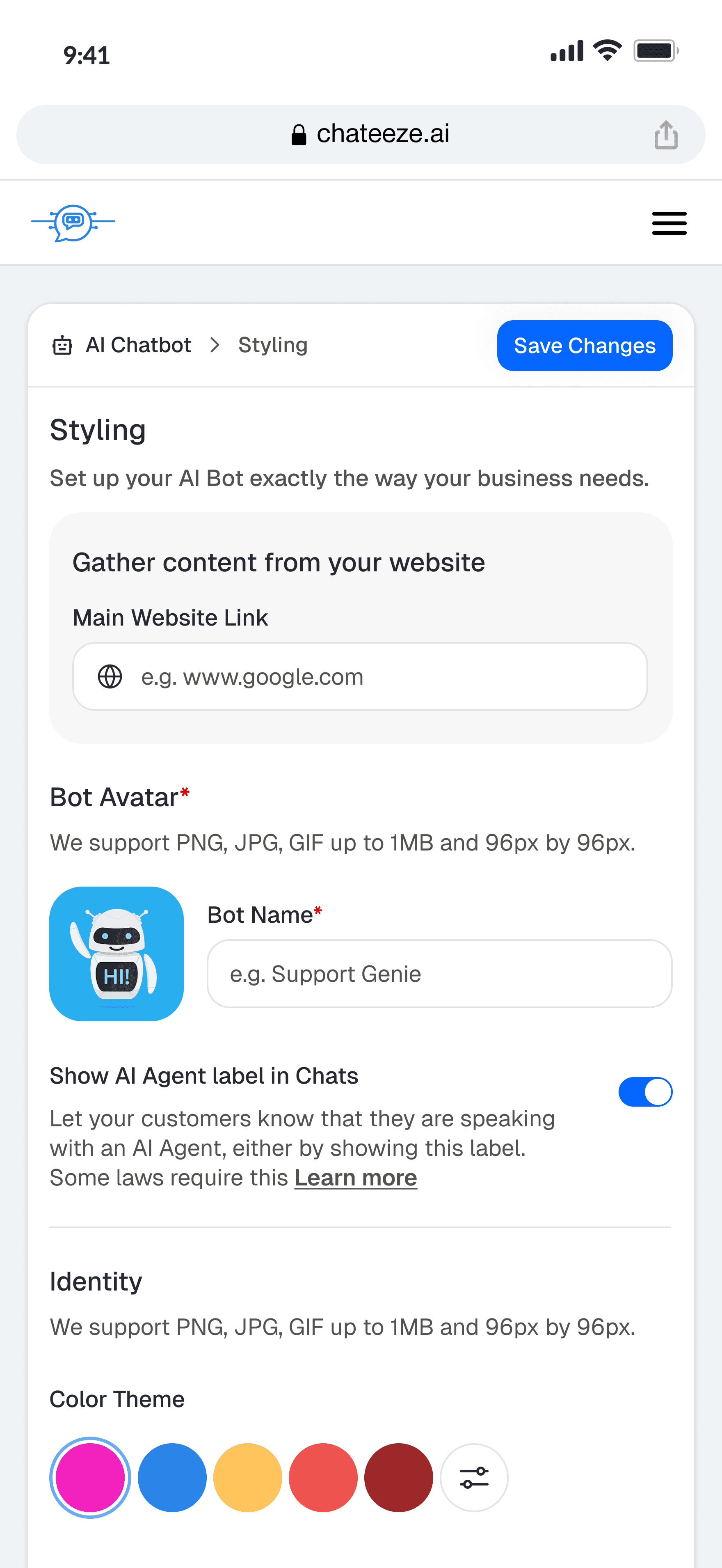 Create an account and customize the chatbot to match your brand. Update colors, logo, name, tone, and welcome message from an easy dashboard. Enable live chat and business hours with no coding required.